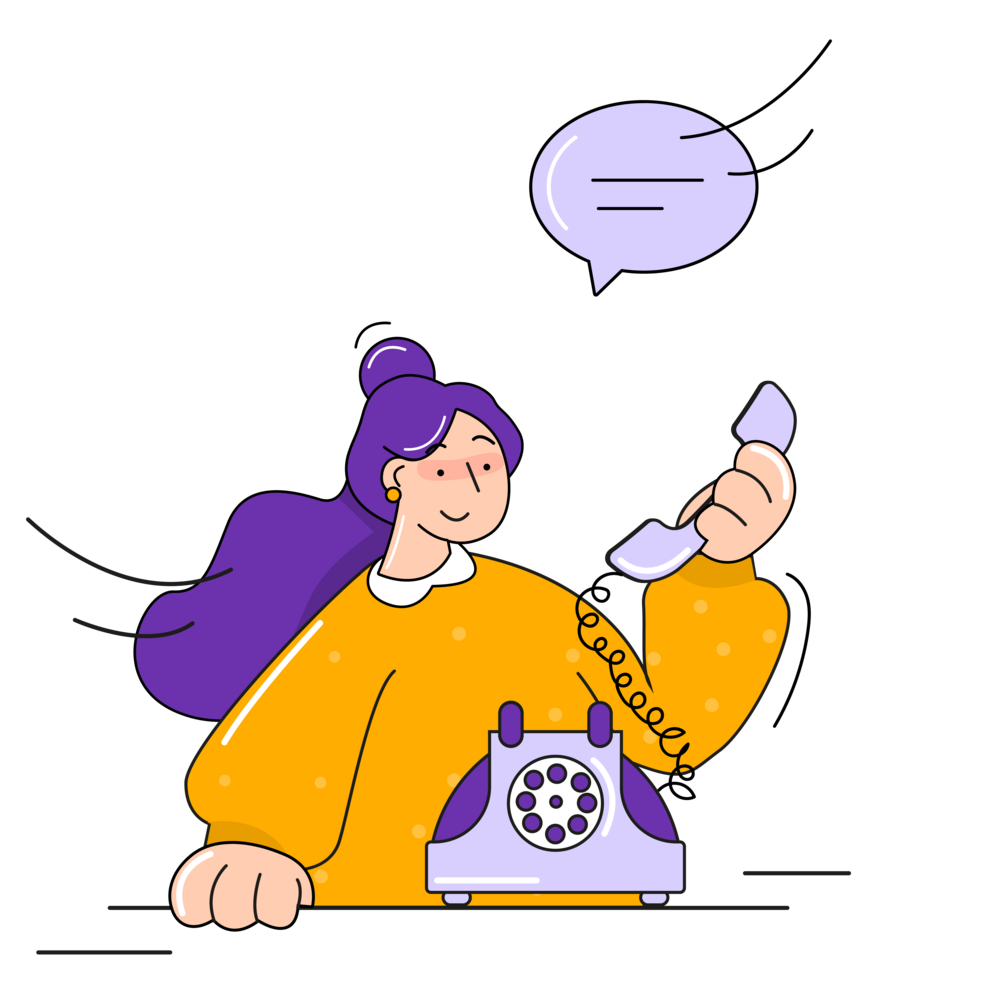 Flat cartoony illustrations with vivid unblended colors and asymmetrical shapes. A beautiful purple hair lady communicates in the bright visual language in various user case categories: welcome, error, not working, support, WiFi, location, files.